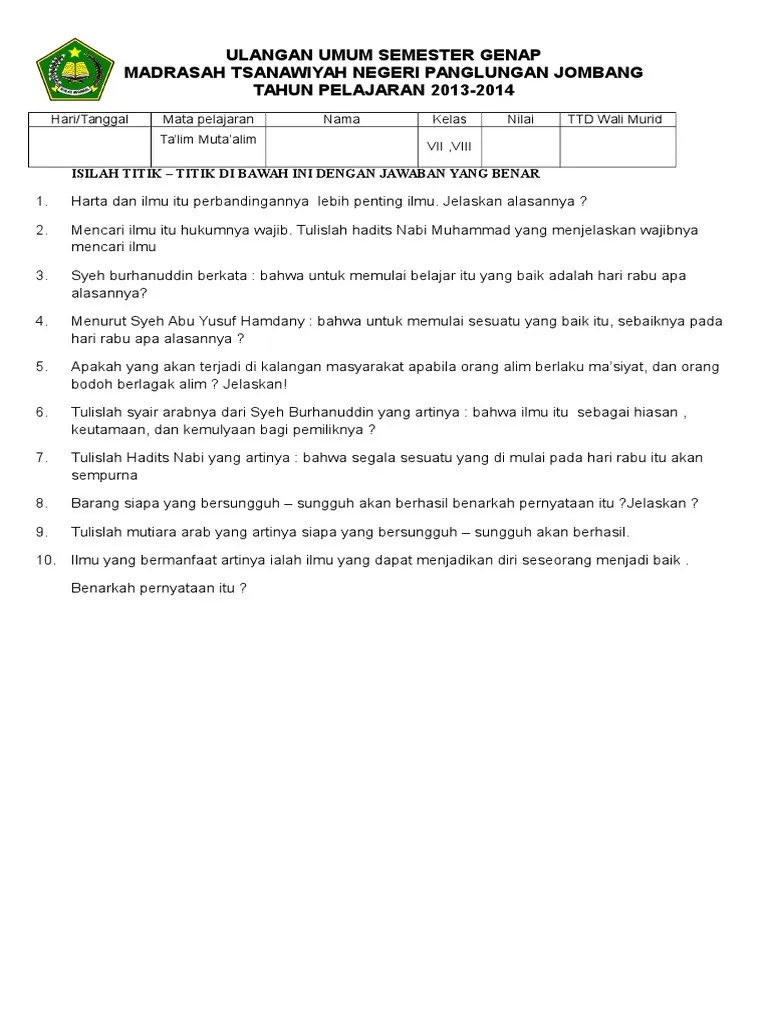 Contoh Soal Ujian Kitab Kuning - Soal Tes Murid Madin Baru Pdf - Bentuk soal dalam tes hitungan ini mencakup tes pertambahan, pengurangan, perkalian, pembagian, pecahan dan bentuk matematika dasar lain yang dikemas dalam soal cerita.adapun yang seing kali dikeluhkan atau dirasa sulit oleh sebagian besar peserta ujian masuk stan akan kami bahas disini dalam bentuk contoh soal.. Adapun perihal pengisian tanggal awal riwayat pmk adalah … Worksheet gratis belajar bahasa inggris tentang anggota tubuh dan fungsinya untuk anak. Aina mendapati darah haidnya mula keluar pada hari ahad jam 8.00 pagi. Kali ini admin menulis contoh apersepsi dan motivasi dalam pembelajaran. Pertimbangan teknis kepala kantor regional viii bkn nomor.